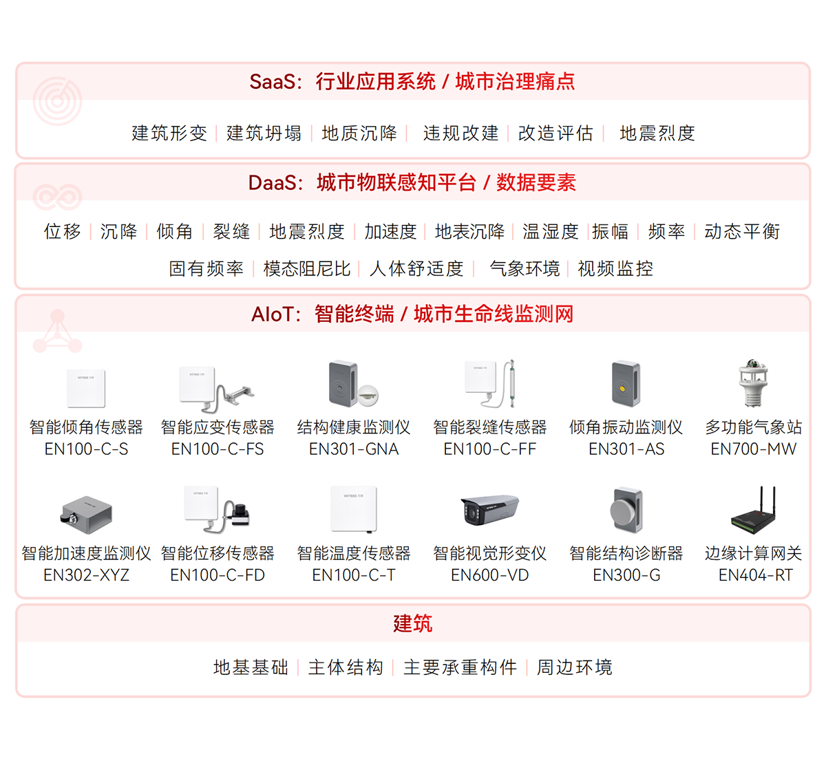 實時監(jiān)控建筑結(jié)構(gòu)健康狀態(tài),通過位移、沉降、傾斜、溫濕度、裂縫和動態(tài)平衡、自振頻率的數(shù)據(jù)收集分析,對潛在災(zāi)害進(jìn)行提前預(yù)警,對突發(fā)事件應(yīng)急報警,為結(jié)構(gòu)坍塌監(jiān)測預(yù)警分析和滑坡監(jiān)測預(yù)警分析提供數(shù)據(jù)支撐,實現(xiàn)對建筑健康狀態(tài)的實時評估。